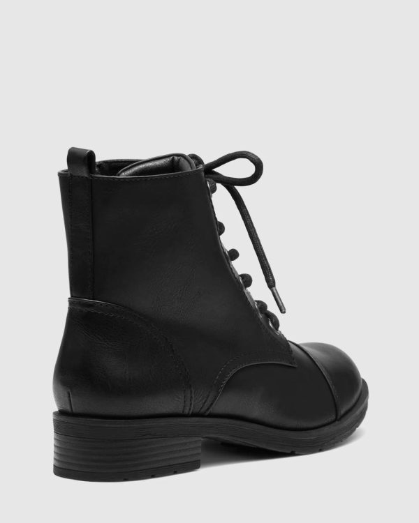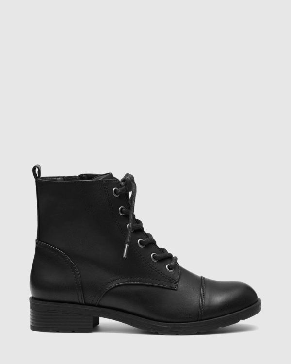 Kaitlynn our new lace up combat boot for this winter, with a refined toe shape, full length side zip and luxe nubuck look finish. This classic pull-on combat ankle boot is your wardrobe essentials this winter and is sure to end up on heavy rotation all season long. Synthetic Upper, Lining and Outsole. Heel Height: 3cm