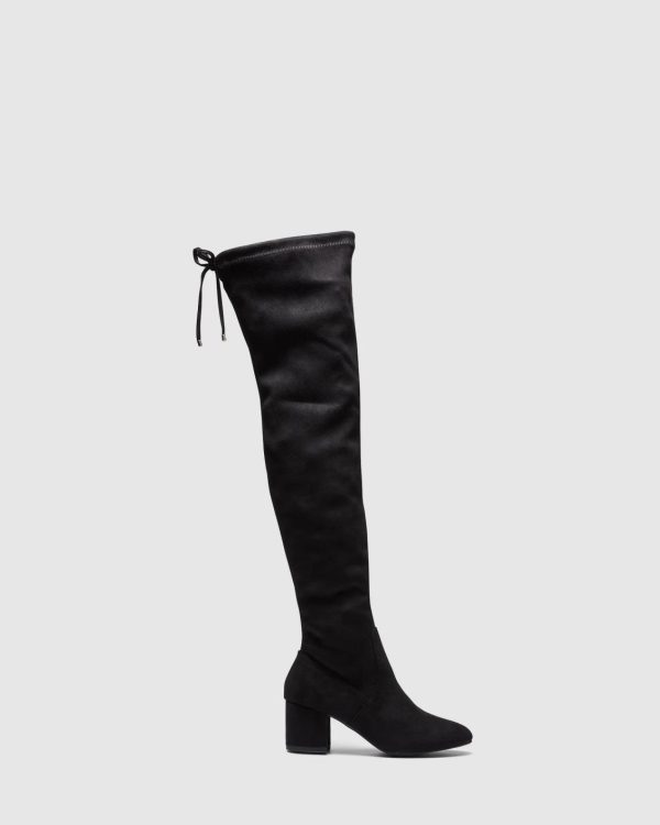 Low Heel Over the Knee Boot with Ajustable Lace. Synthetic/Suede Upper, Synthetic Lining and Outsole. Mid Girth: 31cm. Leg Back Height: 55cm. (Based off size 6) Heel Height: 5.5cm.