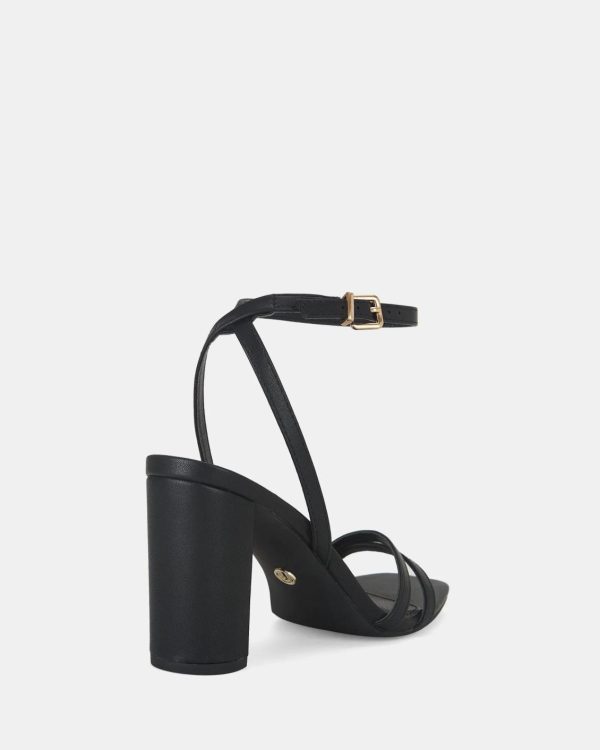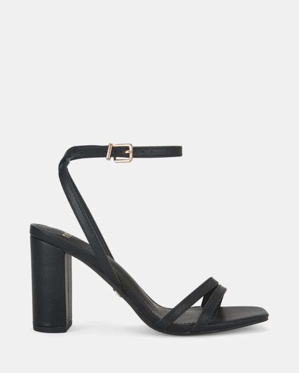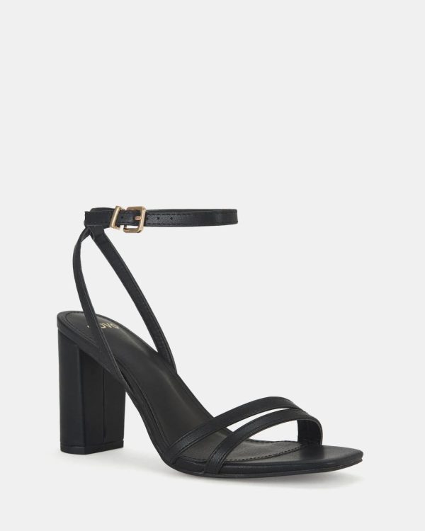 LINDSAY is here to set your night outfits on fire! Add a touch of edgy sophistication to any outfit with this sensational high heel, that comes with a square open toe, strappy upper and an ankle strap with a gold buckle for fastening. The sleek leather look finish ensure these sandals will be a go-to in your shoe collection for seasons to come.