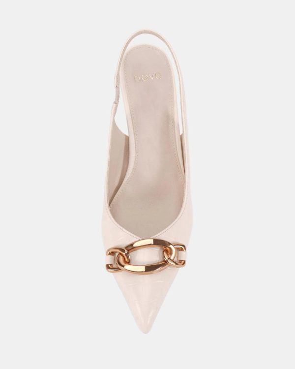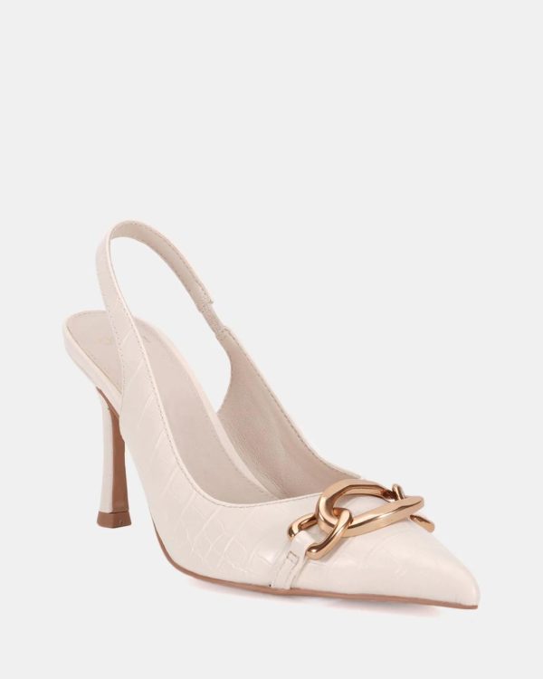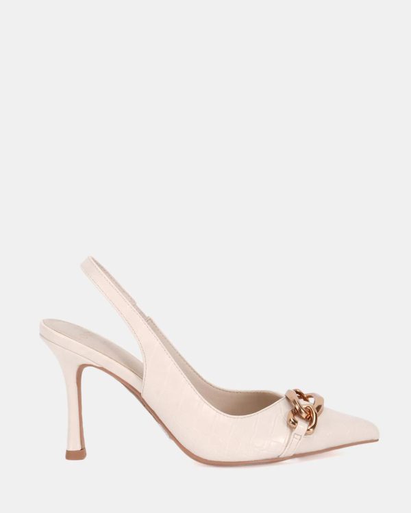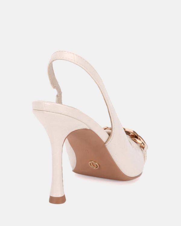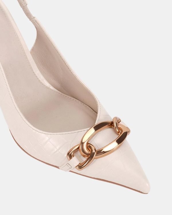 The refined IDALIA pump is crafted from croc-embossed leather-look upper in a sharp, pointed-toe silhouette. Featuring a sleek stiletto heel and a metallic chain on top, this pair is finished with a flexible slingback strap for a vintage-inspired finish. Juxtapose the glossy pump with crisp looks, or pair it back to a short dress.